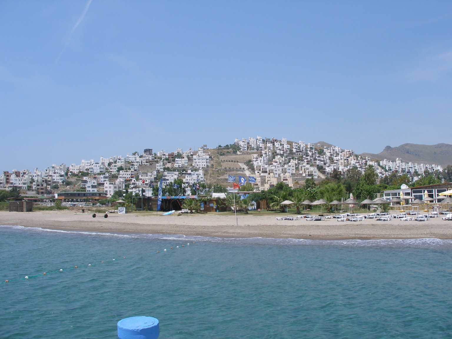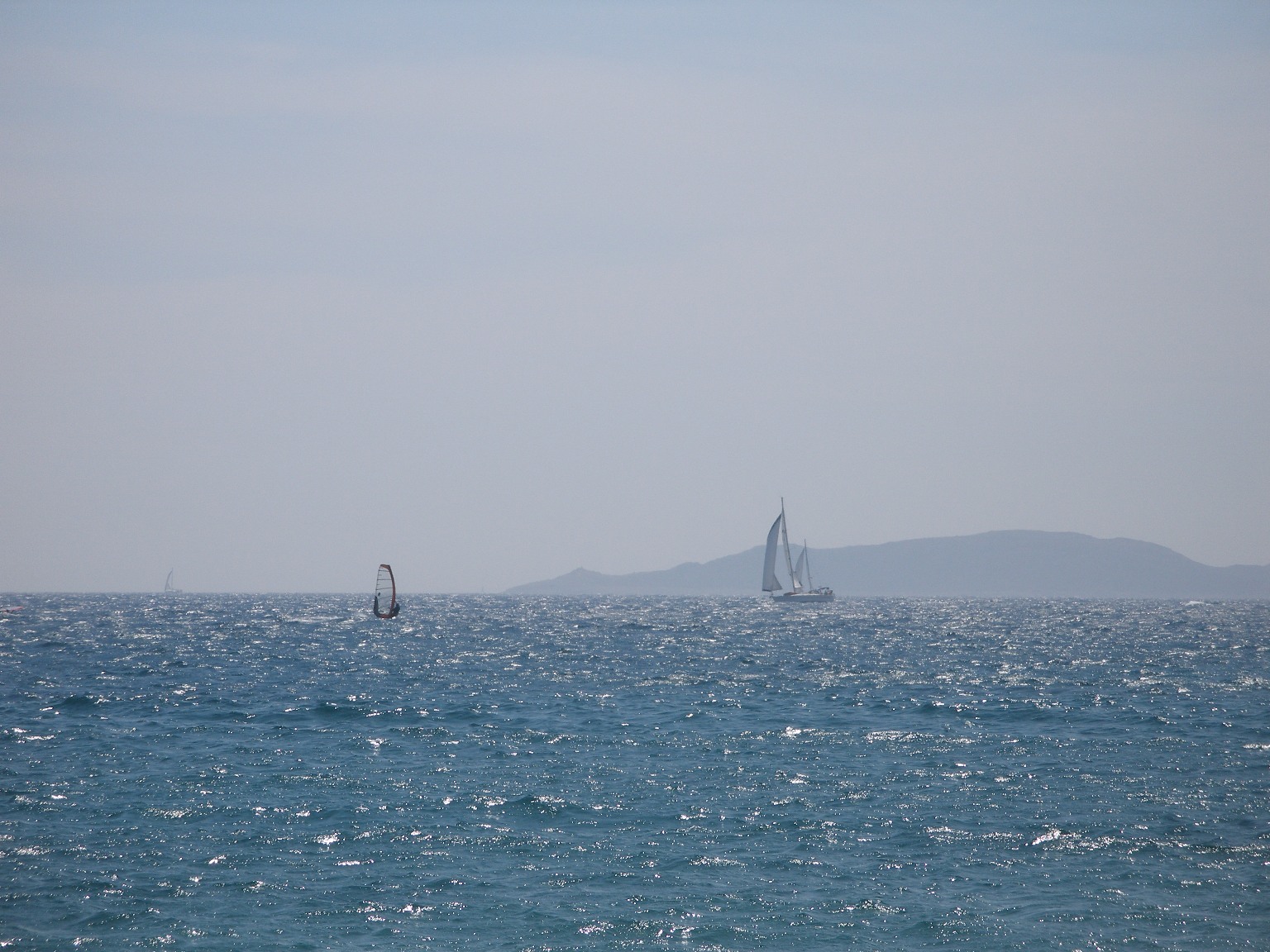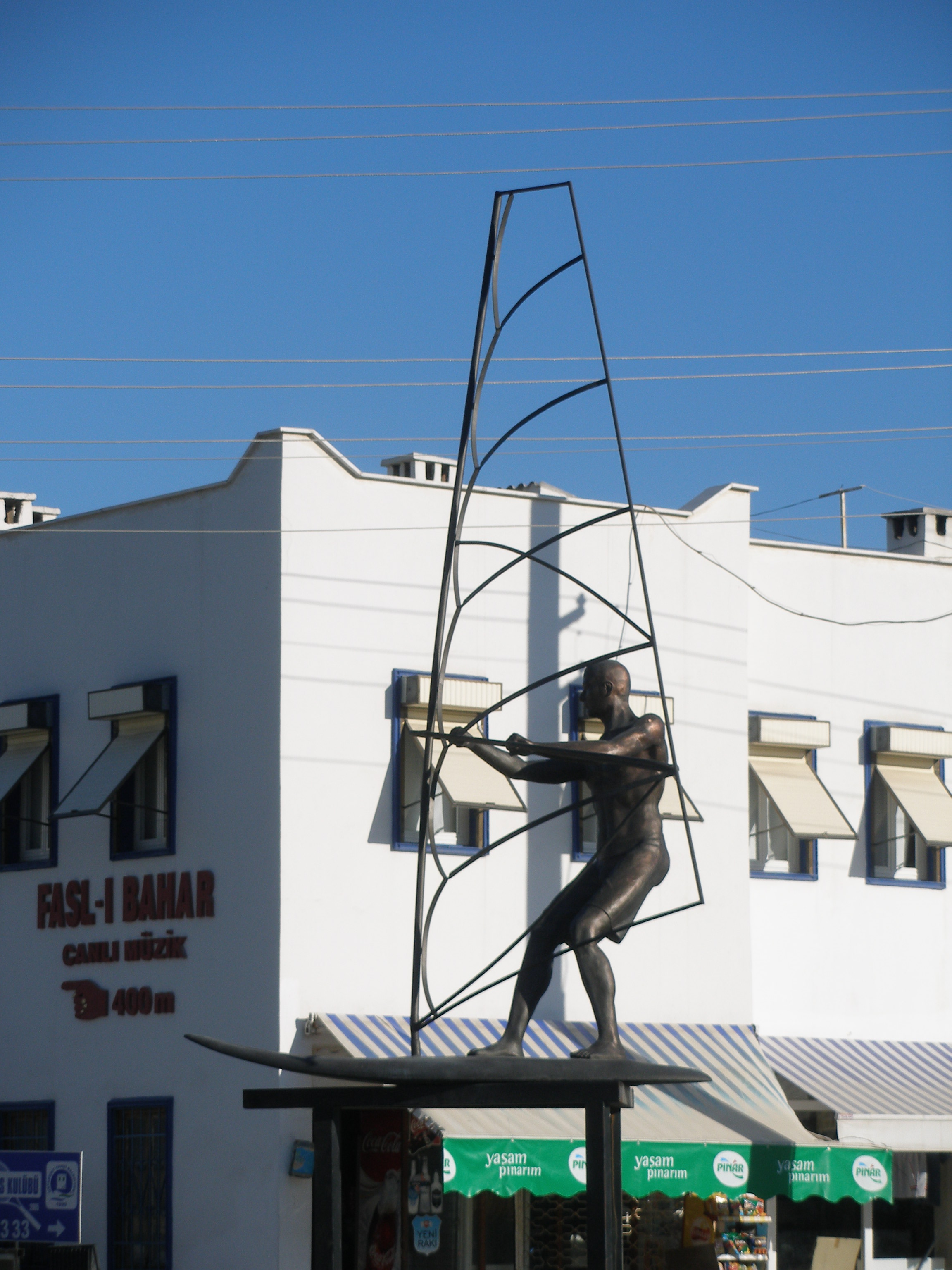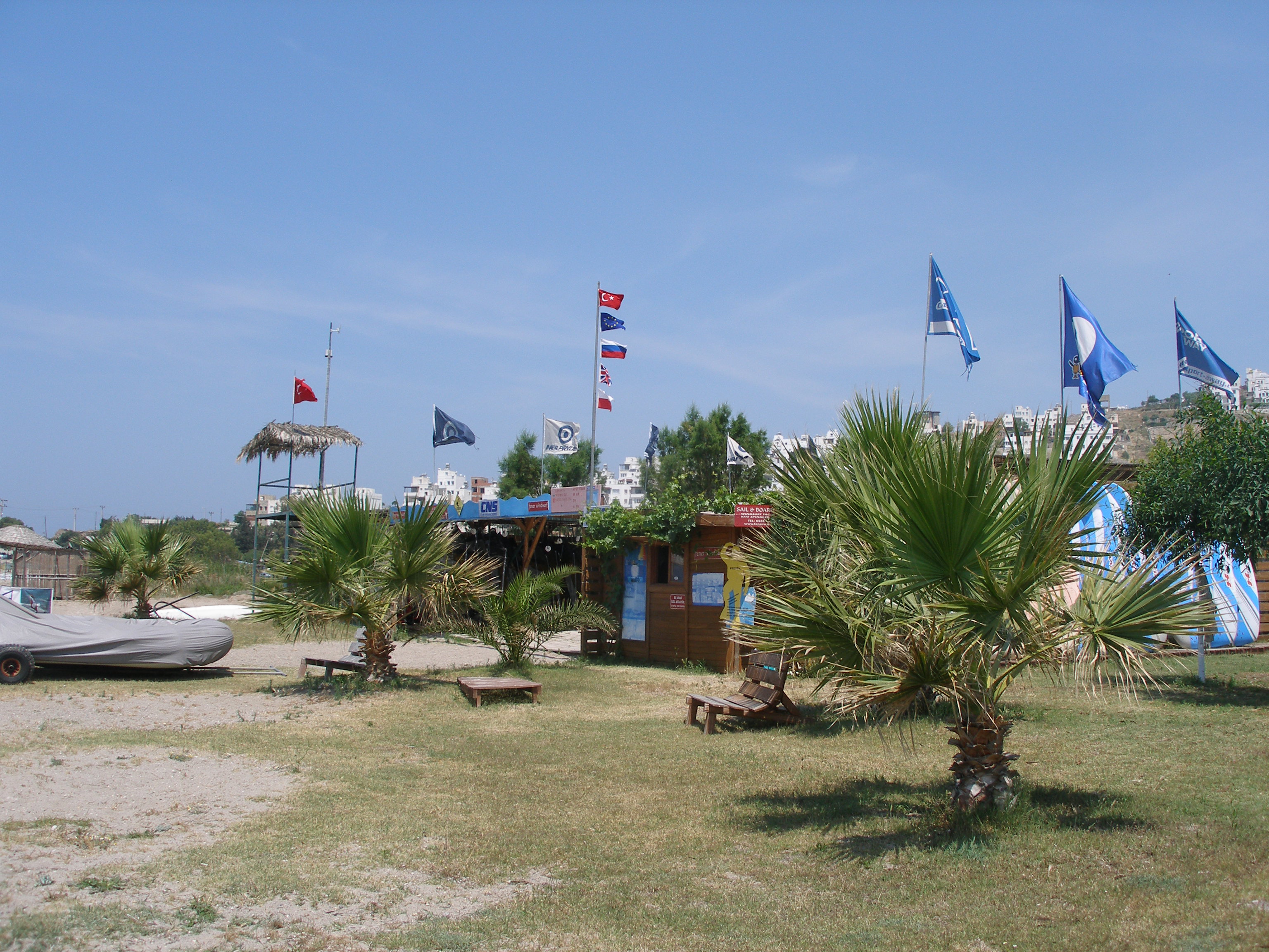 Вот с прогнозом - проблема. По идее, место должно быть привлекательно с точки зрения виндсерфера. Узкий пролив (кажется километров 6) между турецким берегом и греческим островом Кос. Ветер дует вдоль берега, с севера, разгоняется в трубе, и накатывает неплохие волны, очень удобного направления для прыжков.