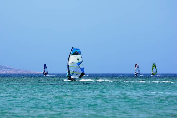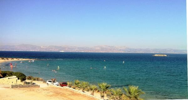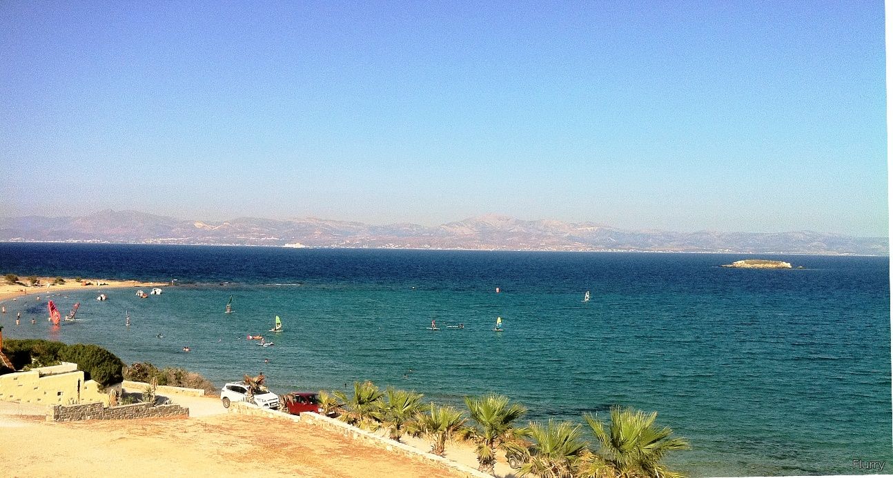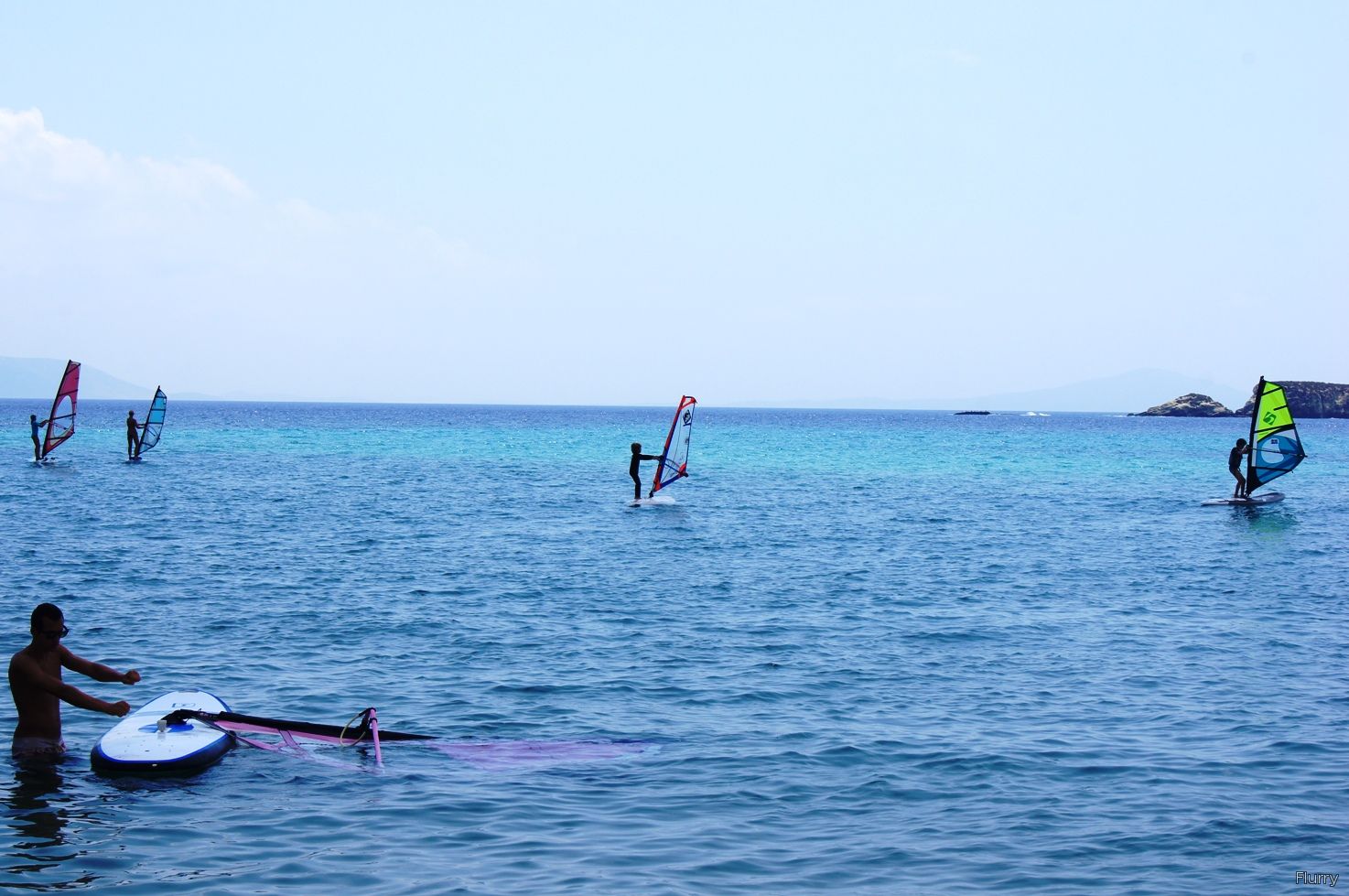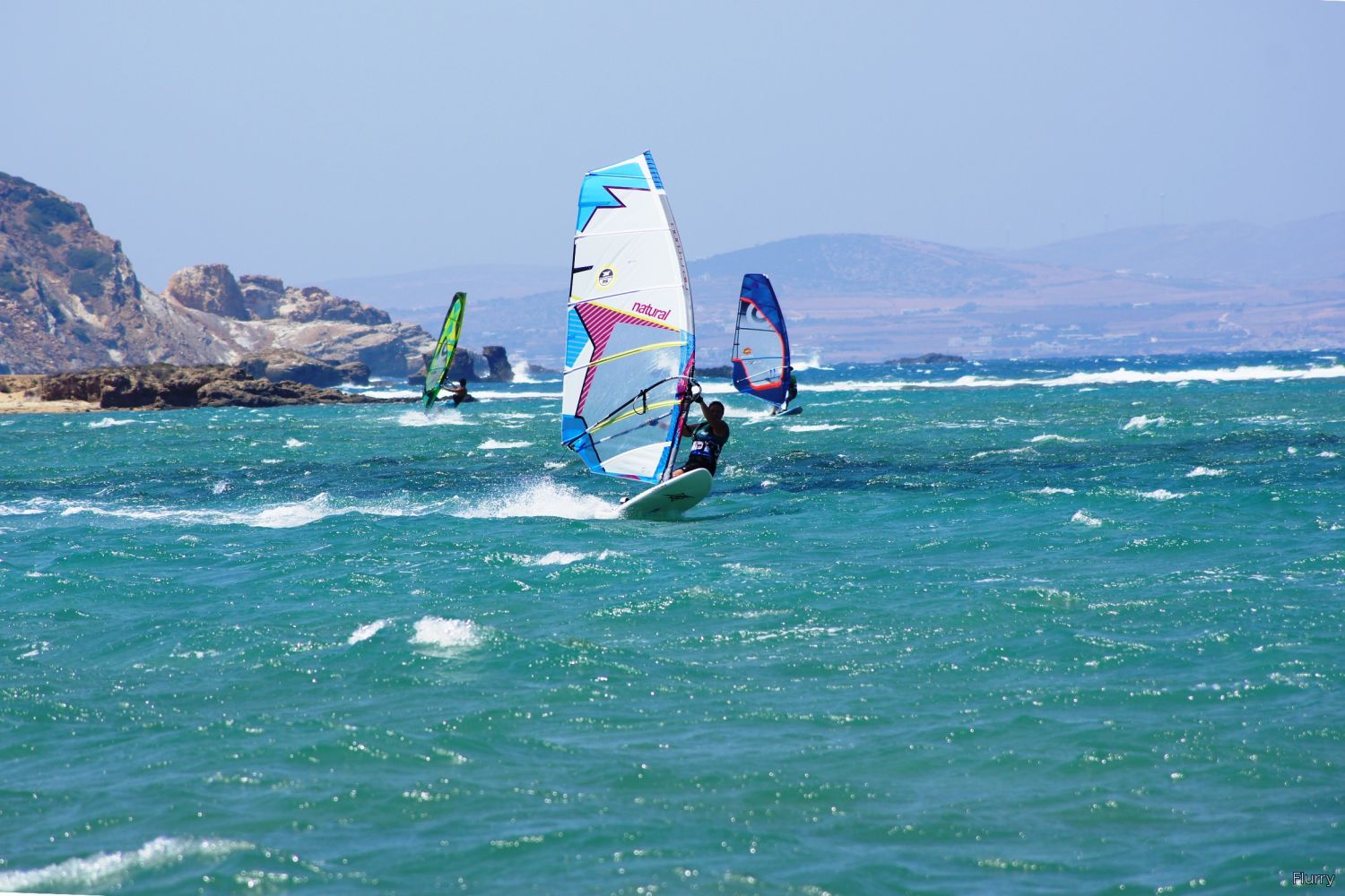 В общем то по катанию на Наксосе оказался не то, чтобы «провал», но хотелось бы большего. За неделю смогли три раза катнуть на своих столитровках, и даже был день, когда я начала аж на парусе 4,2 (как на Гранд канарии), и лишь потом поменяла на 4,7. Но такой день был один. В остальные ветер ходил-гулял, приходилось постоянно менять доски и паруса, с чем в общем-то на станции была бы проблема, если бы мы не заказали на нашу компанию чуть ли не все ходовые размеры. ("дай Инне парус 5,7 вместо 7,3, только обязательно "same color" - шутил Парис")