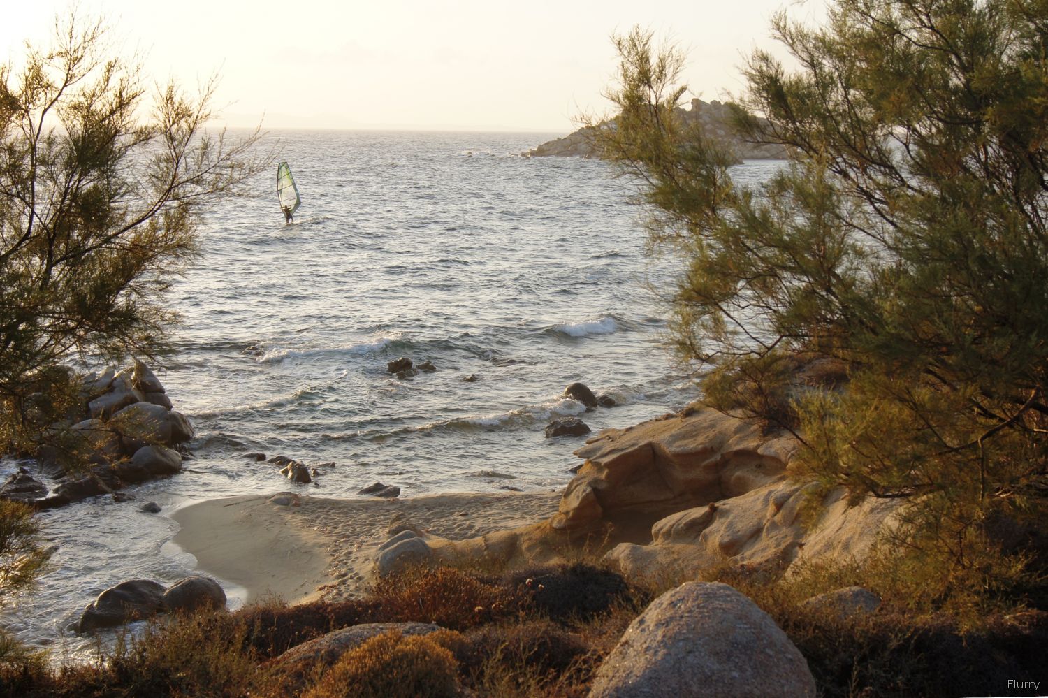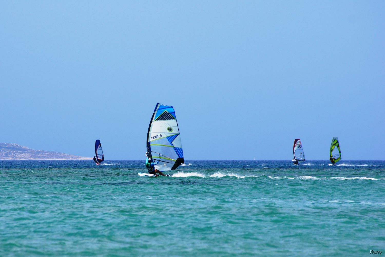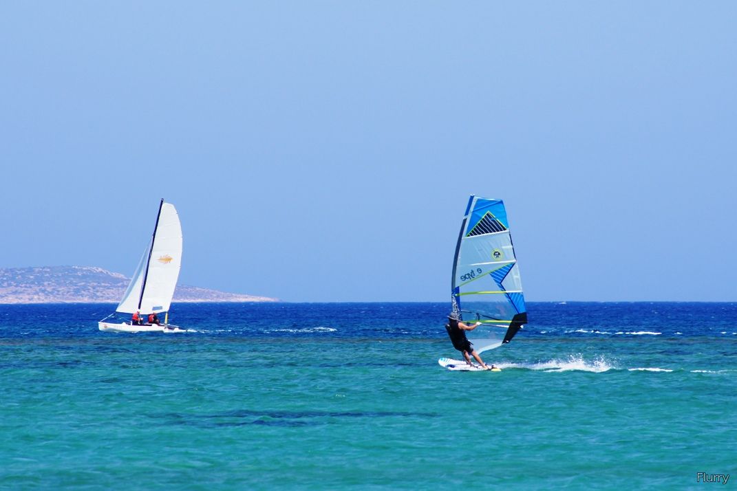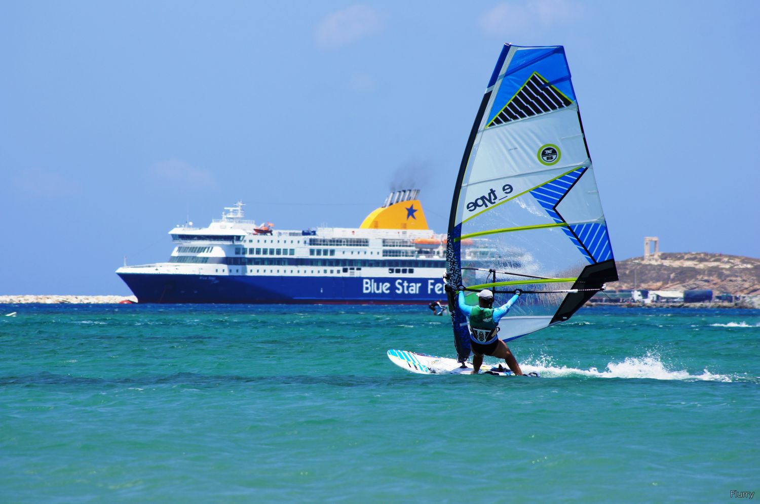 В общем то по катанию на Наксосе оказался не то, чтобы «провал», но хотелось бы большего. За неделю смогли три раза катнуть на своих столитровках, и даже был день, когда я начала аж на парусе 4,2 (как на Гранд канарии), и лишь потом поменяла на 4,7. Но такой день был один. В остальные ветер ходил-гулял, приходилось постоянно менять доски и паруса, с чем в общем-то на станции была бы проблема, если бы мы не заказали на нашу компанию чуть ли не все ходовые размеры. ("дай Инне парус 5,7 вместо 7,3, только обязательно "same color" - шутил Парис")