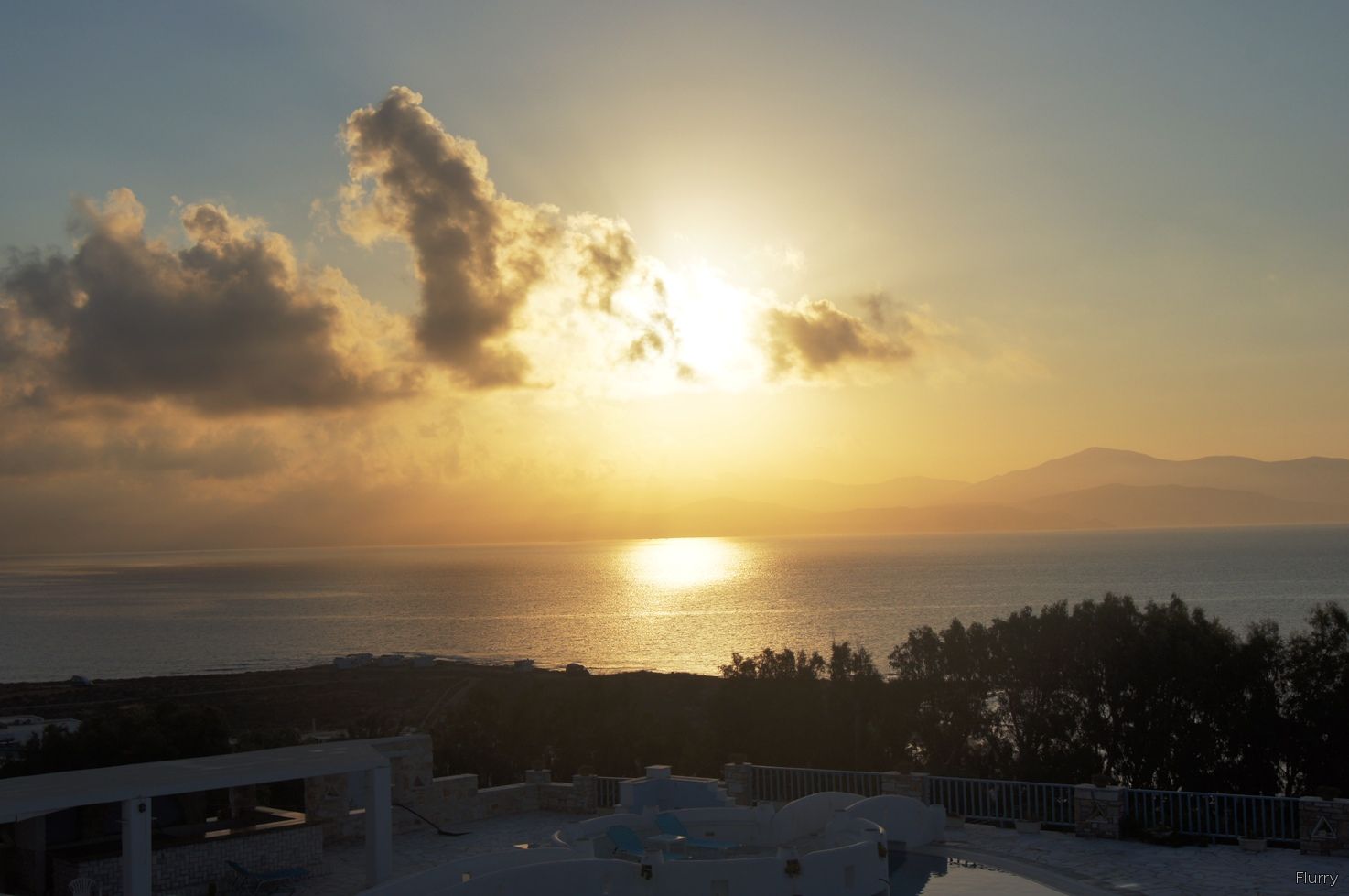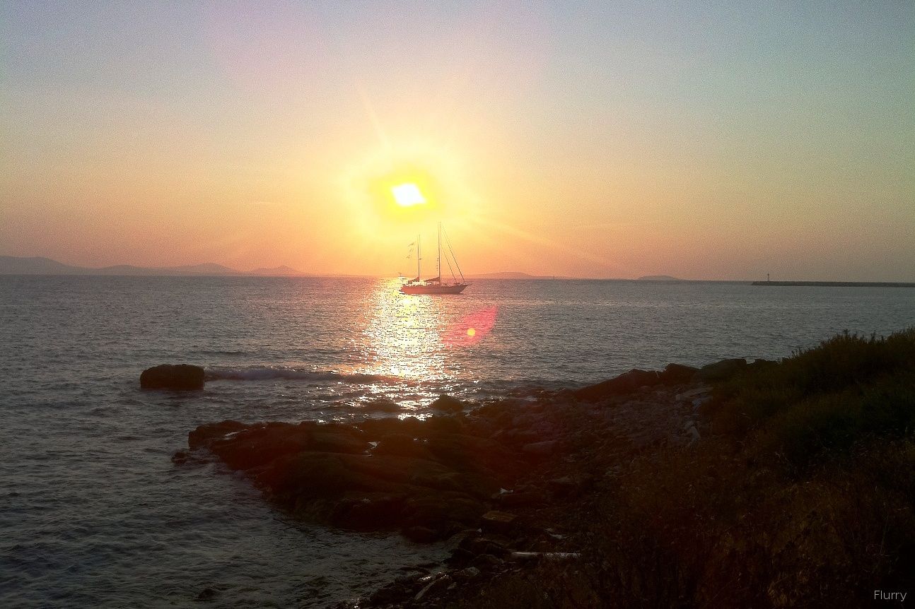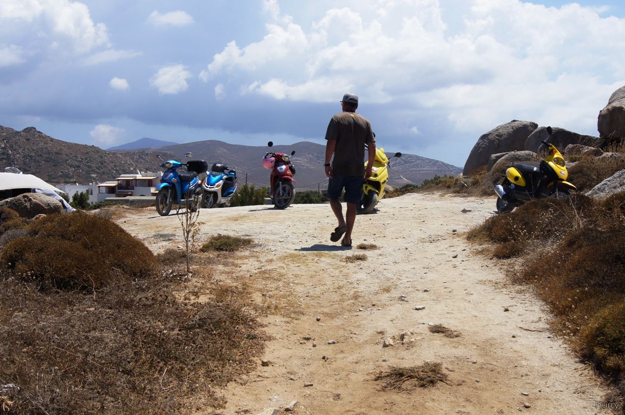 В результате если на Накосе мы любовались закатами и стартовали при нормальном ветре правым галсом, то на Паросе с точностью до наоборот – встречали (если успевали проснуться) восходы и уходили в море левым, привычным галсом. Но острова, несмотря на всю их похожесть, разные. Наксос больше, и более зеленый, горки на нем повыше, самая высокая гора в Кикладах там. Парос поменьше, посуше, выглядит более пустынным. Наксос остров сельский, оживленный, но толп нет. Даже в путеводителе написано, что туризм не является его приоритетным направлением, и хотя в Хоре туристов много, но и там, в тавернах греков достаточно. А чуть подальше от столицы, даже на дорогах, за исключением «main road», асфальт практически пропадает, так что передвигаться проще на скутерах или квадроциклах. Парос больше для туристов, дороги лучше, отели, апартаменты по всему побережью… долина бабочек тоже есть (как на Родосе)
