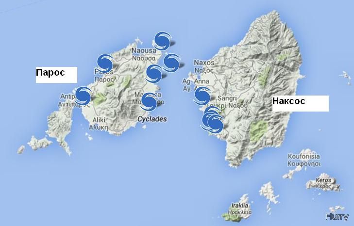 Основные (катальные) места на маршруте: острова Наксос и Парос, были рядышком, друг напротив друга и споты располагались по обе стороны пролива между островами, Наксос восточнее, Парос западнее.