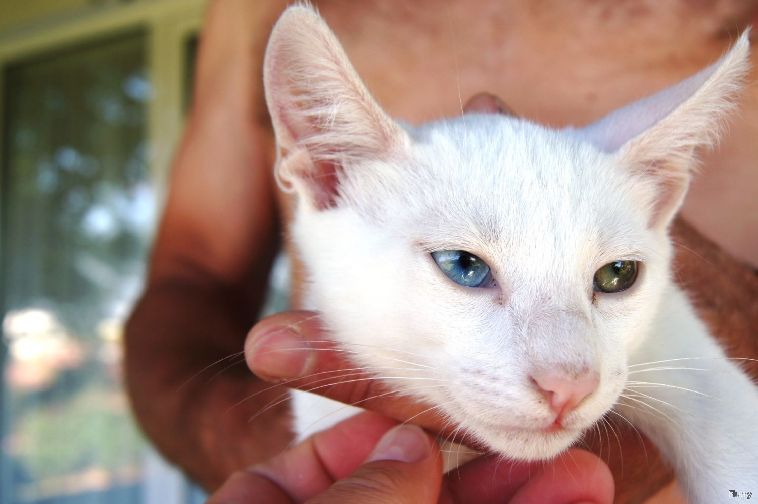Белый котенок с разноцветными глазами, красивый домик в цветущем саду, со второго этажа видна лагуна...