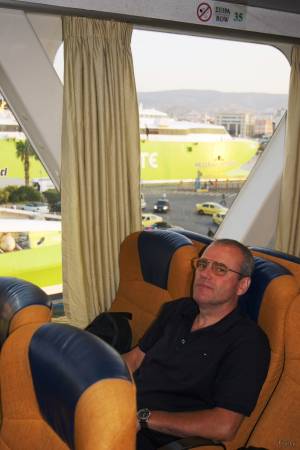 Утренний кофе, вкусный, большая чашка за 1 евро (завтрак не брали в отеле, поедим на пароме) и вперед за билетами и на посадку. Билеты на паром, в случае покупки по интернету, надо получать в кассах, но это быстро. И около 7 утра мы уже погрузились на скоростной паром, правда не красный Vodafon как два года назад, а зеленый… Но внутри все было так же.