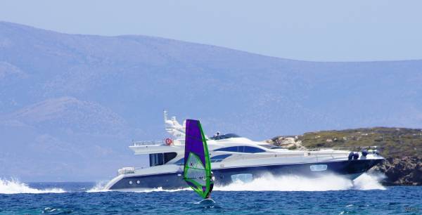 Попробовали так же и все другие возможные направления ветра за неделю. Увы, долгожданный мельтеми так и не пришел. Поэтому катались на чем придется, в основном, на парусах 7,5 если удавалось таковые урвать. На станции, еще не перестроившейся под изменения климата, таковых было 2 штуки, еще одна 7.0, и немного 6 – 6,5 Изголодавшиеся по недостатку катания серферы расхватывали их при малейшем дуновении ветерка. Поэтому однажды мы вообще (надеясь на прогноз) взяли паруса заранее и тупо ездили до острова и обратно. Но зато, когда все-таки подуло во второй половине дня, мы были на лучших комплектах. Смешно было смотреть как удивляются немцы (которым достались только шестерки) когда я их легко обхожу…А вот слаломисты на этой неделе отрывались по полной. Несколько больших парусов наяривали по гладкой воде огромные восьмерки без остановки….