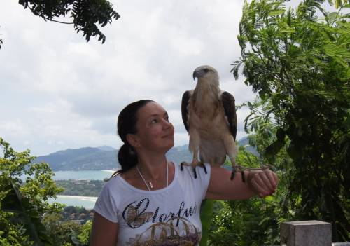 Попросила сделать фото тоже. Таец посадил мне на руку здоровенного орла, а затем стал привязвывать его веревкой к руке.