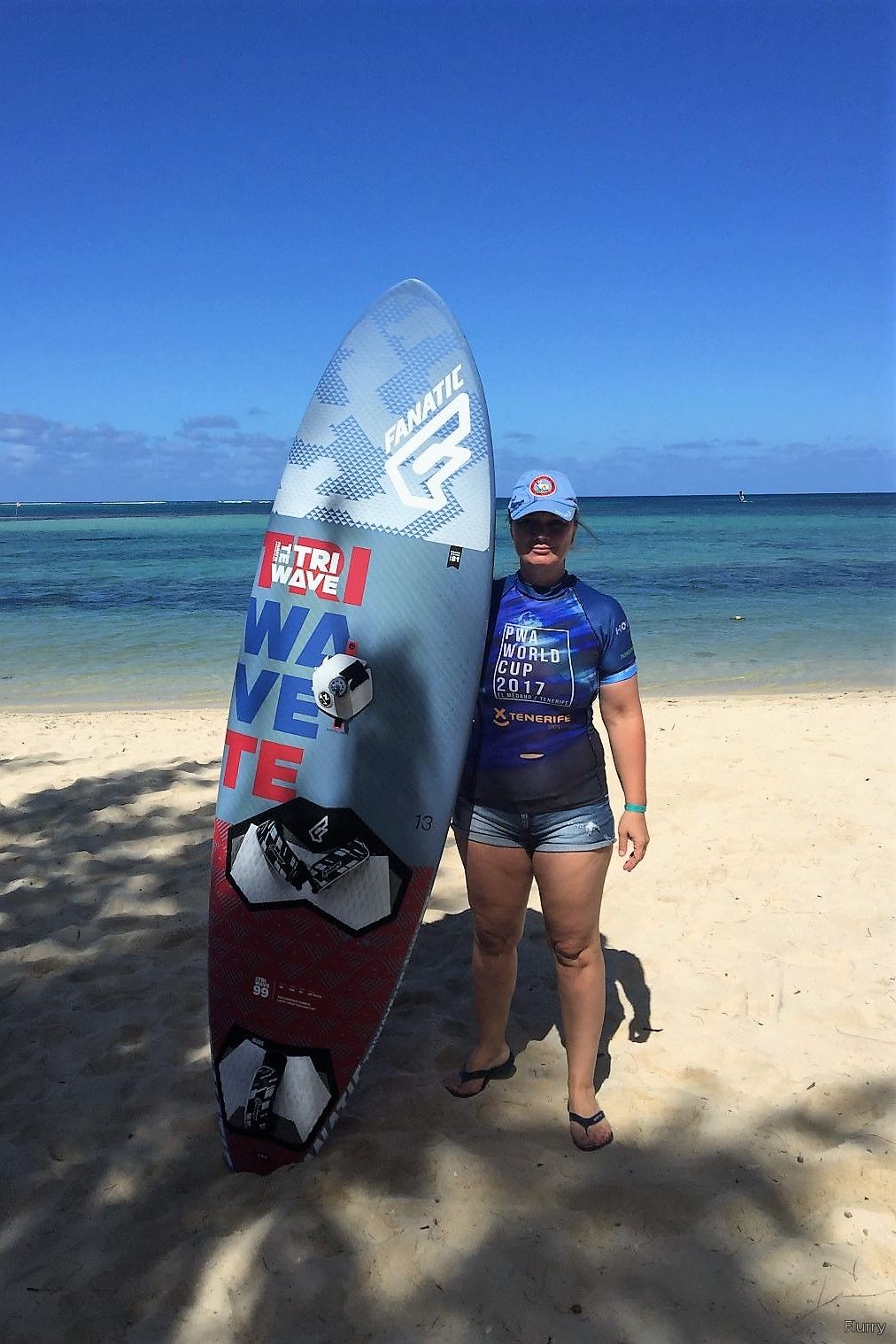 26 августа. Первый день оказался очень комфортным по катанию. Солнышко, тепло. Ветер мне на парус 5,7, Олег взял 6,4 На станции народу много, в океане – не очень. Волны были хорошие, но далеко не ходила, сказывалась усталость перелета, сил особо не было. Забронированная трехплавниковая Triwave-99 (так и не решилась на 88) нового сезона была чудесной, голубенькой. Номер 13. Для меня она настолько комфортна, что порой могла стоять на ней без глиссирования в петлях.