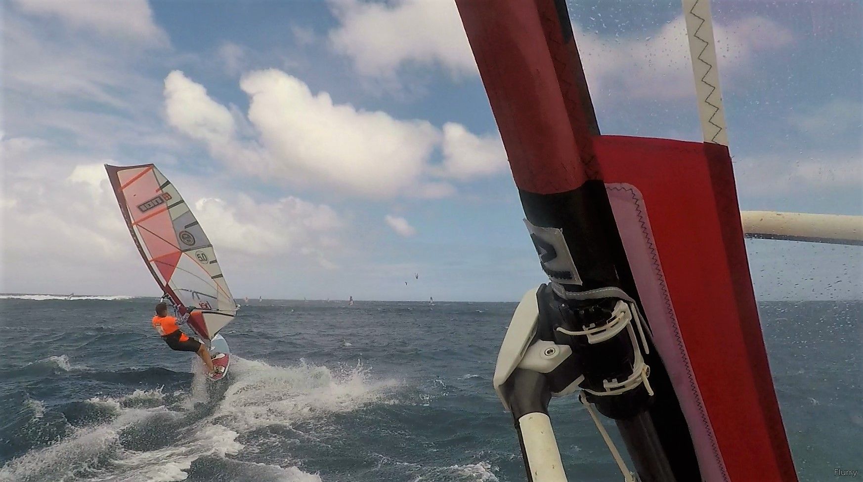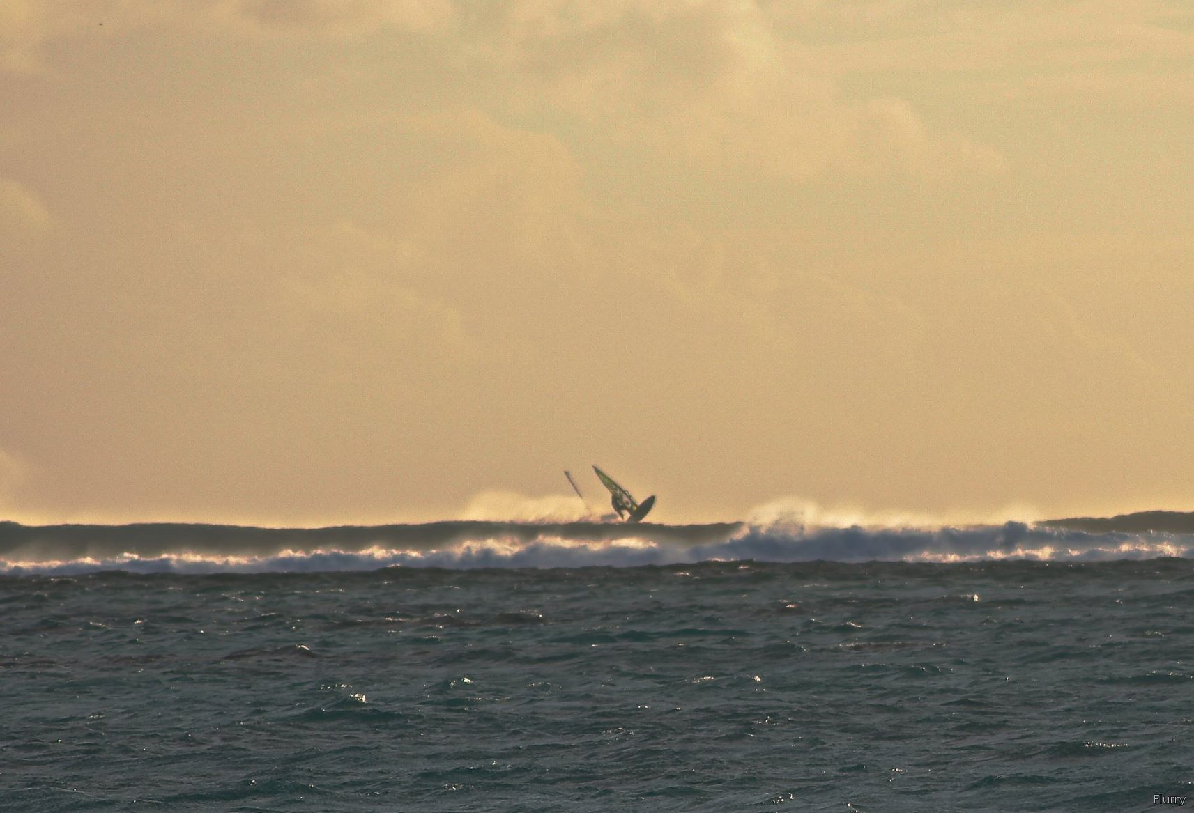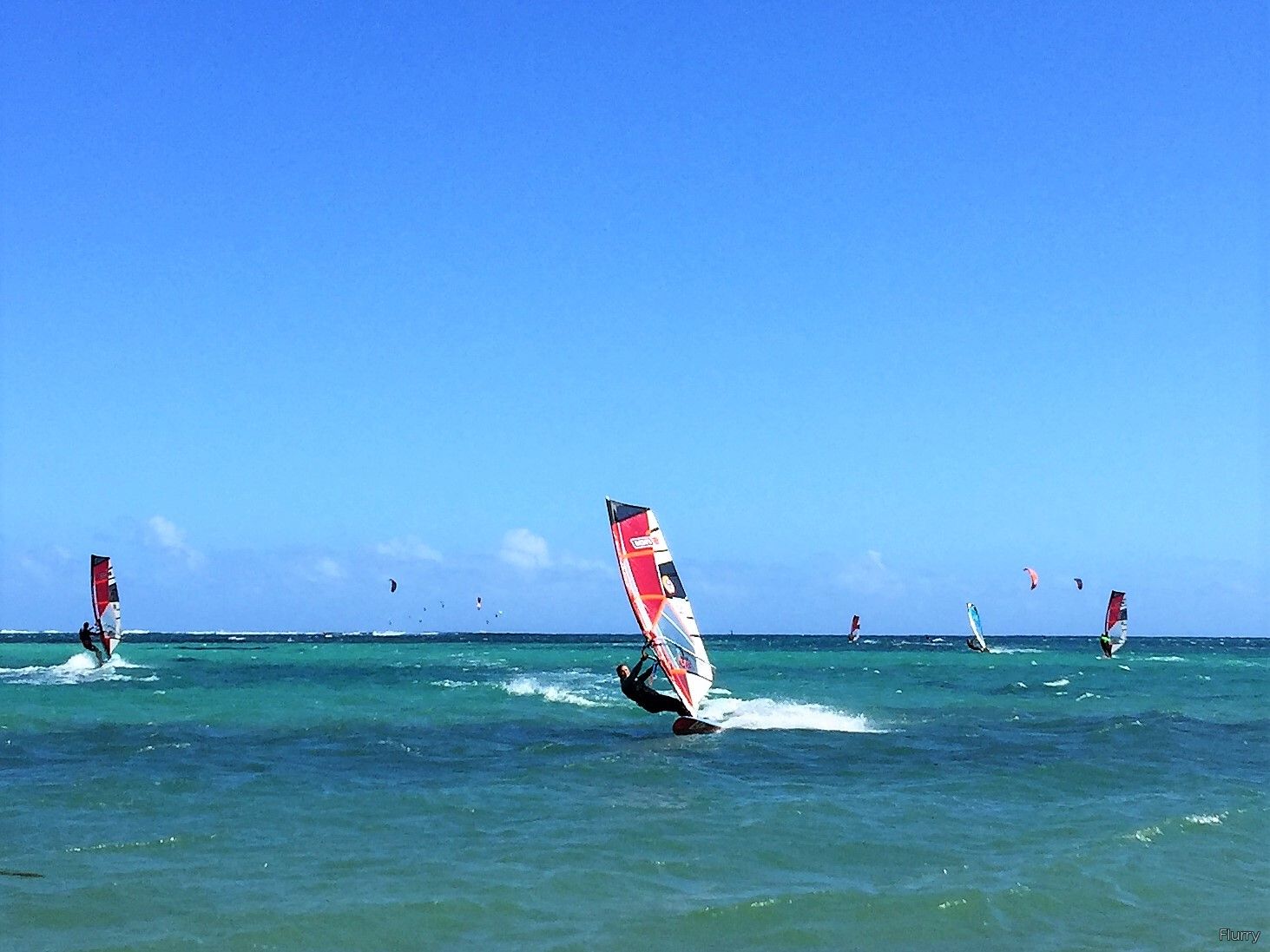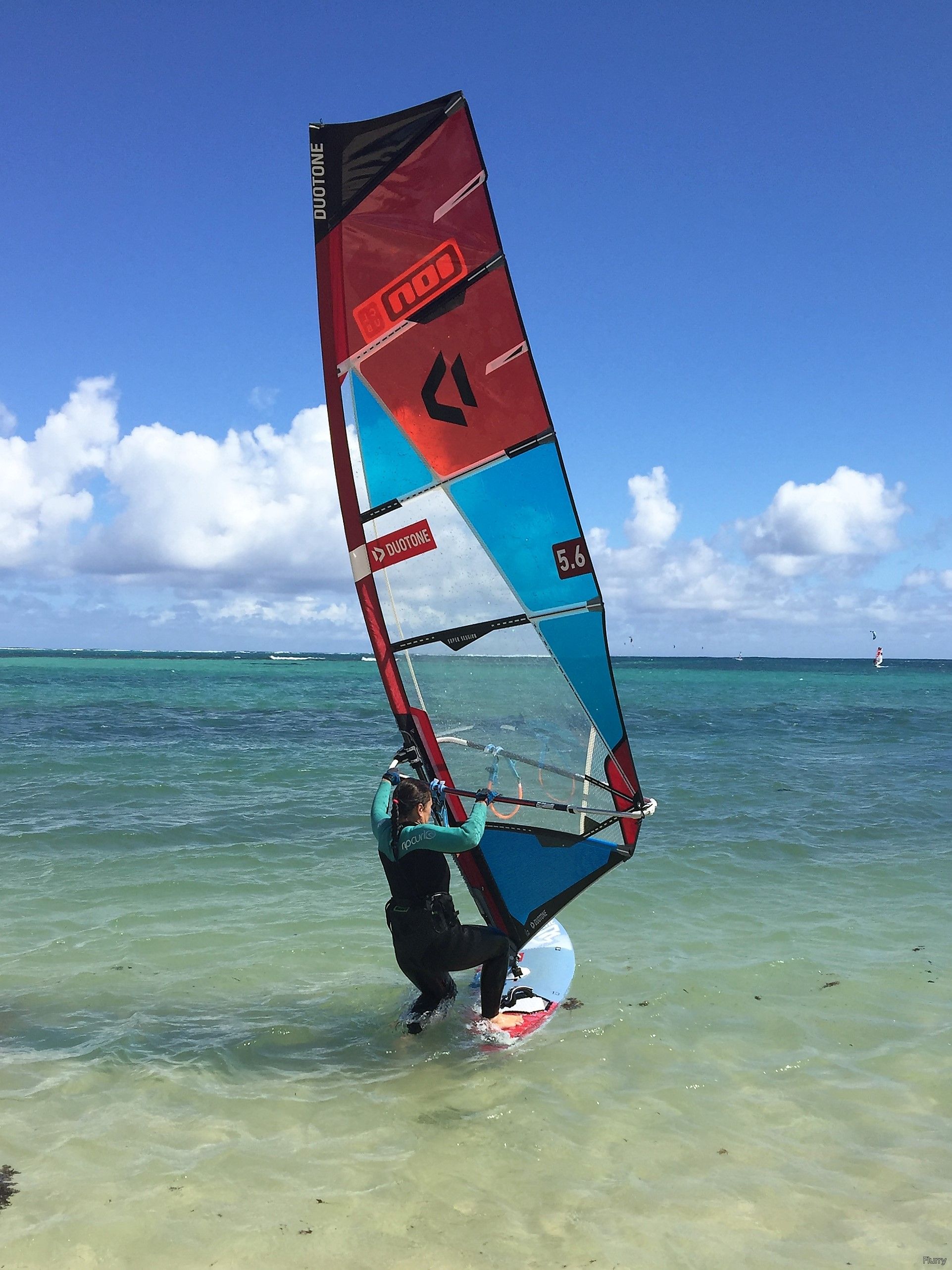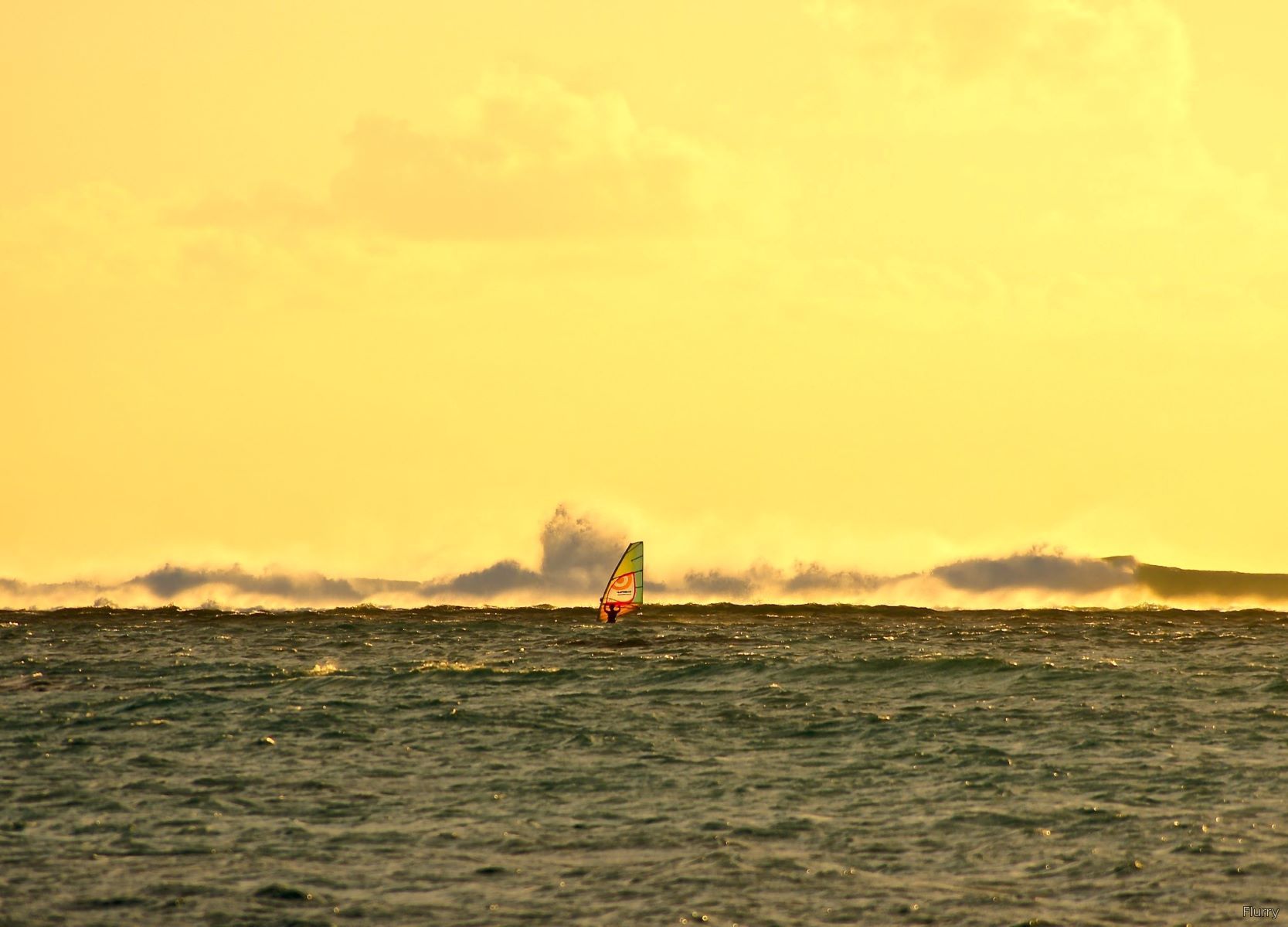 Ну вот я осталась одна. С утра «оттачивала» повороты на доске Олега и парусе 5.6. Конечно, это не глиссирующие фордаки, но Олег успокаивал, говорит главное я схватила, а дальше пойдет. Накрутившись в лагуне пошла в канал, волны там уже поднялись, но еще равномерные, повороты стали и там получаться, но вот на своей доске все гораздо сложнее. К счастью, Маврикий не место для любителей лекальных поворотов. Там далеко, между огромных валов, в провалах ветра, скорее нужен быстрый оверштаг или фордак почти на месте (в нашей терминологии power jibe), негде там писать дуги, разворачиваться в идеале надо сразу на верхушке волны. Ну а у берега в лагуне, чтобы полюбовались редкие пляжники у бара с коктейлями? Так там местные и Куба крутят такие штуки, что ваш отточенный фордак покажется им унылым… поворотом…. То ли дело я, когда решалась на полной скорости зайти у берега и вылетала через веревки у купальной зоны… это была интересная сцена.