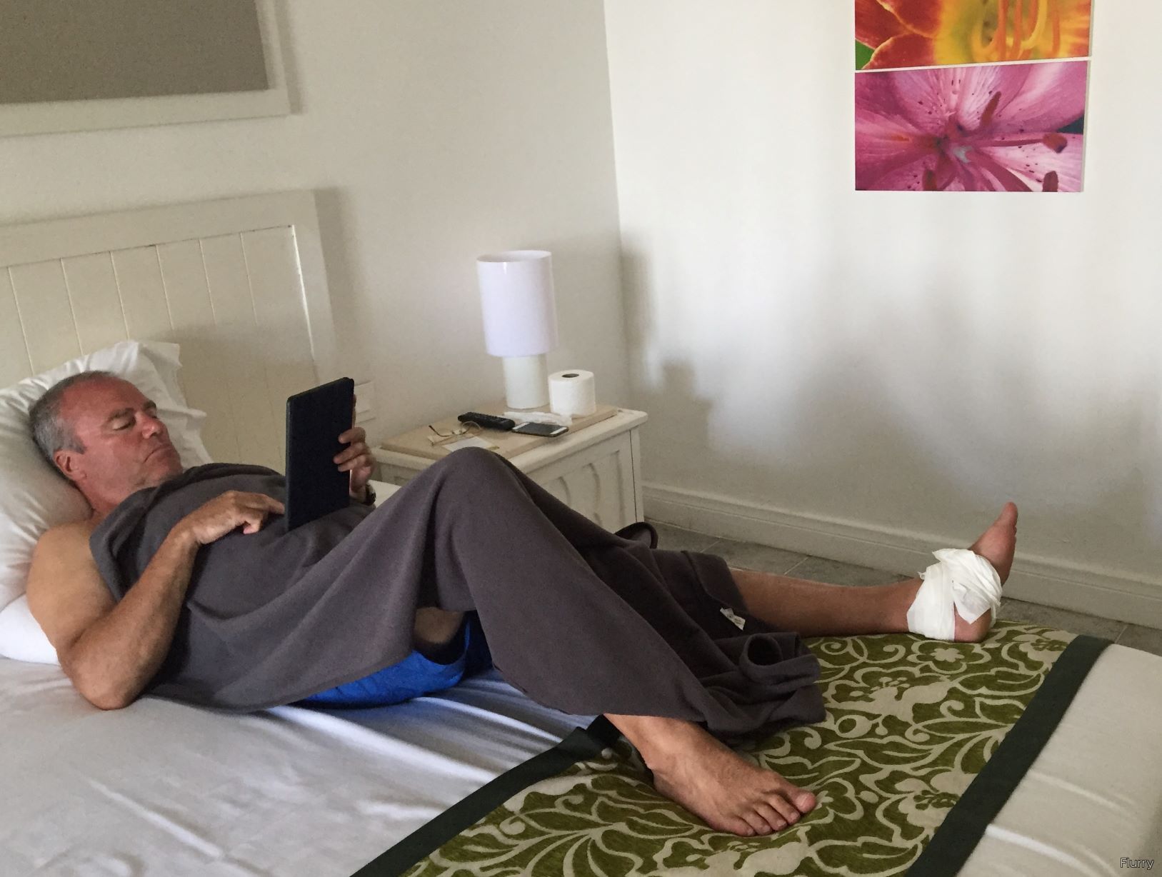 Под конец катания случилась и с нами беда, Олег свалившись на развороте в канале (для изучения моих фордаков мы вместе посмотрели видео Макара, одно из самых понятных, и Олег, похоже, стал задумываться при переброске паруса и падать…) Приехал окровавленный, глубоко разрезав ногу кораллом.. Пошли домой. Засыпали стрептоцидом, благо оказался в аптечке. Зашивать? Не зашивать? Вечер, как вызывать врача не знала, искать страховую..? Вроде царапина… для Олега. Обошлись тем, что было с собой, хотя лучше было бы зашить, на следующий день съездили в Ля Галетт там и аптека и медкабинет, где говорят по русски, накупили всякого полезного, в том числе и шикарный непромокаемый (для серферов-кайтеров) пластырь, с которым Олег и смог через три дня кататься.
