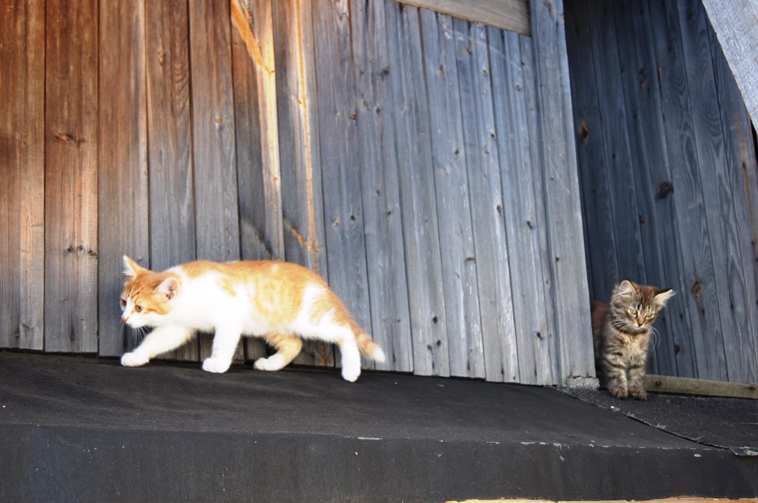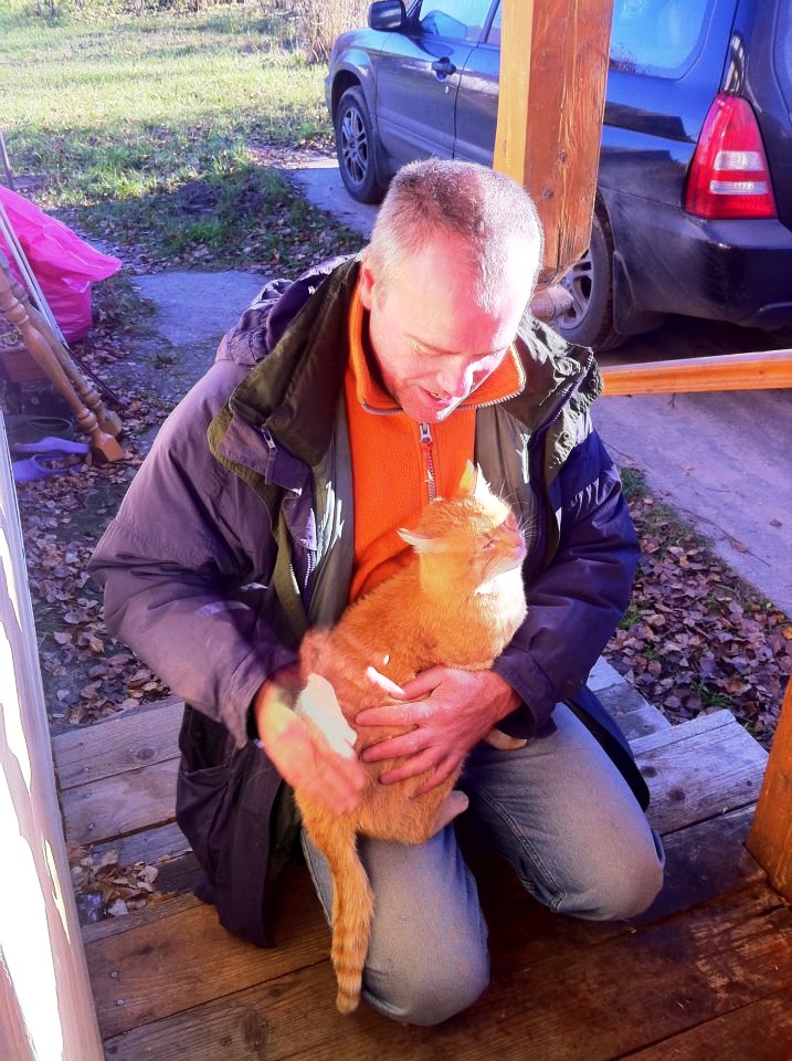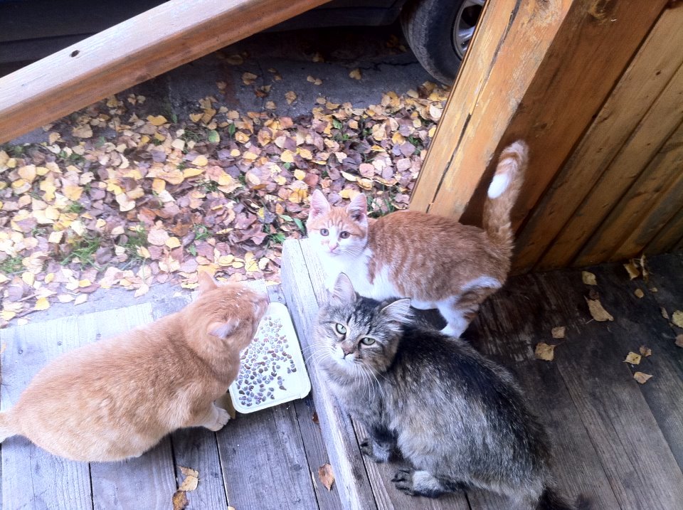 До поздней осени котята тусовались у нас, развлекая всех играми и прыжками с крыши старой бани, где они жили. Папашка тоже приходил, но вел себя уже как дикий, близко не подходил. Но однажды, не выдержав, решил проявить «ласку» Для этого он изо всех сил ткнул башкой в ногу Олегу, и пошел не крыльцо ждать подачку.