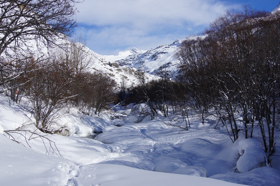 Мне в первый раз в горах захотелось нацепить снегоступы и пойти пешком, а не на подъемнике дальше вверх, по этой прекрасной долине, вдоль незамерзающей быстрой реки, мимо скал и ледопадов, мимо высоких елей, цепляющихся за камни, по снежным дорожкам среди сугробов, истоптанных следами горных зверюшек и птиц.