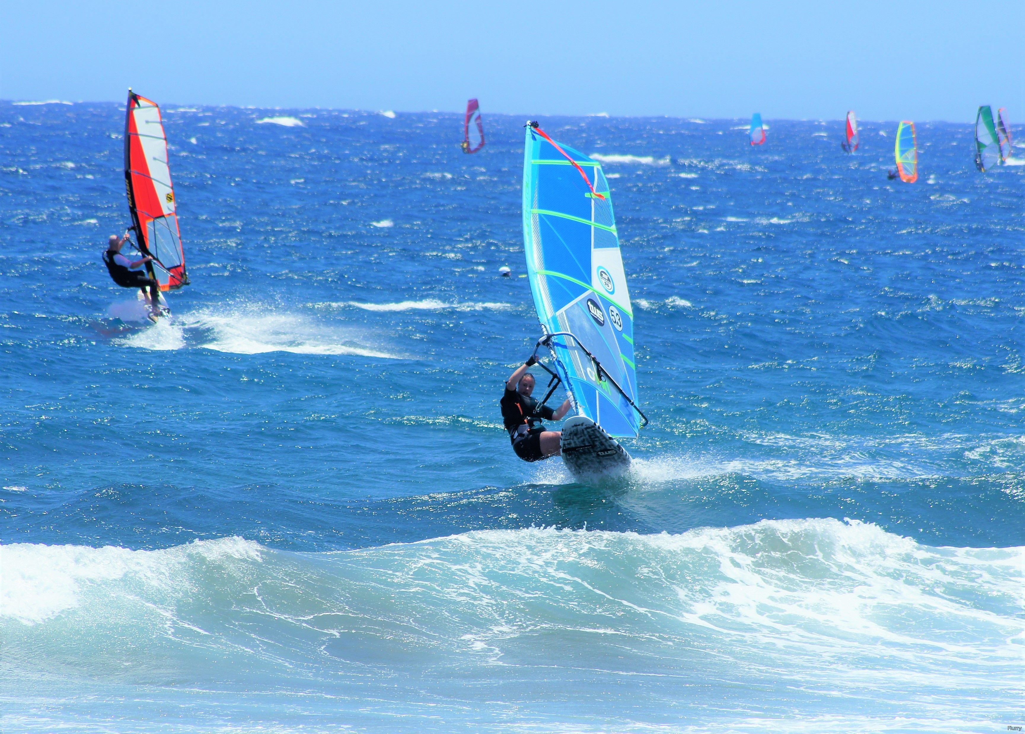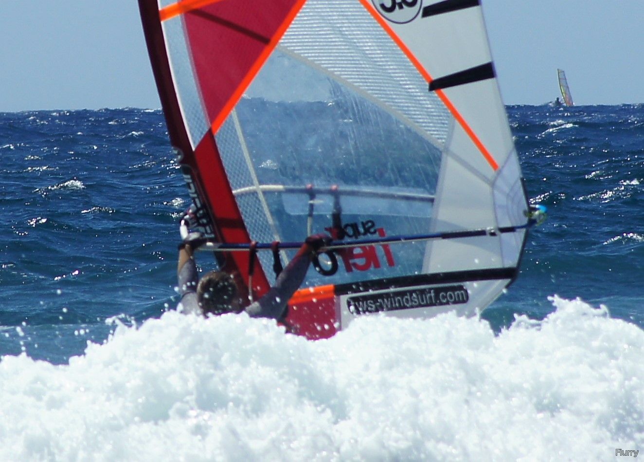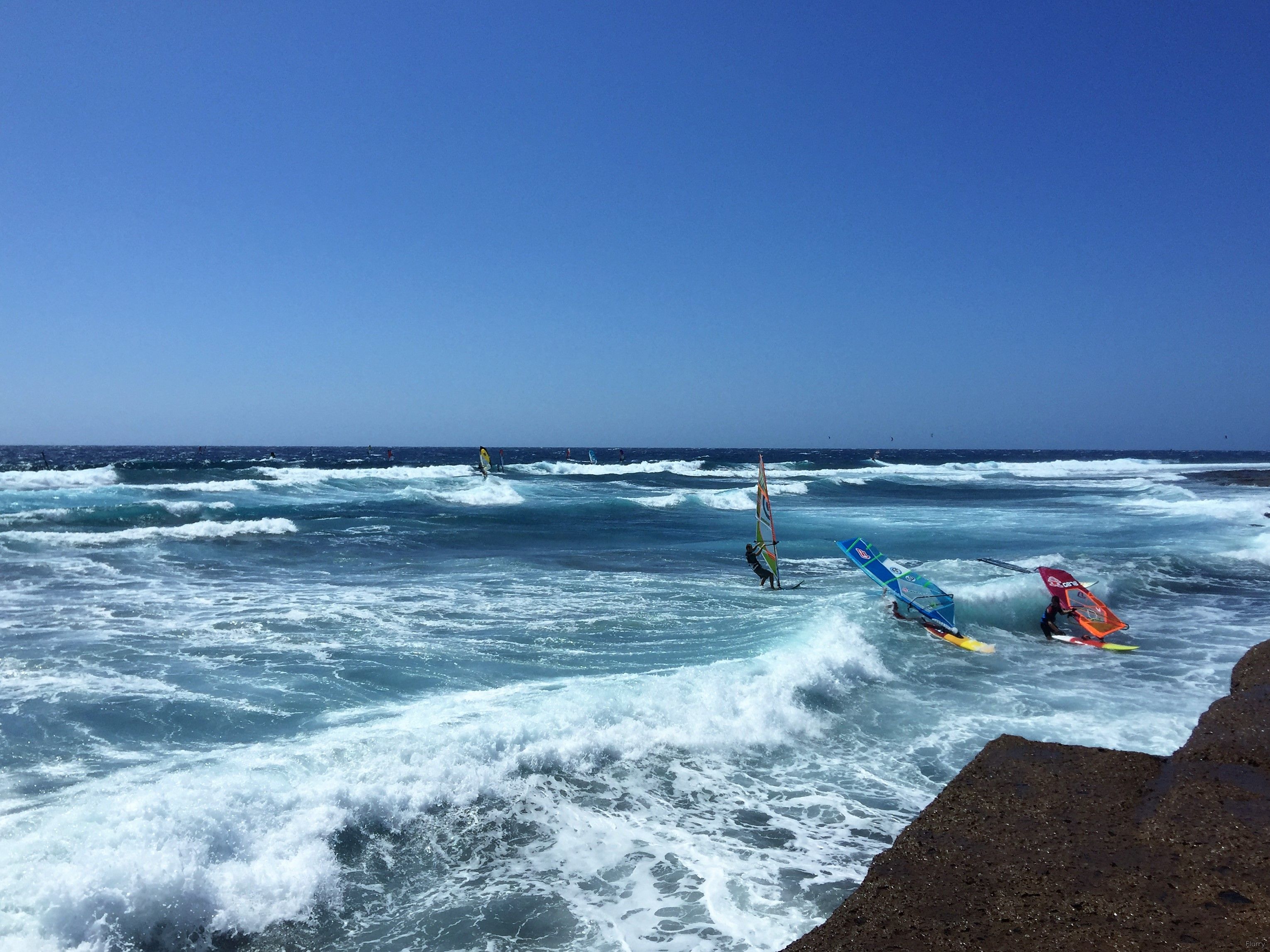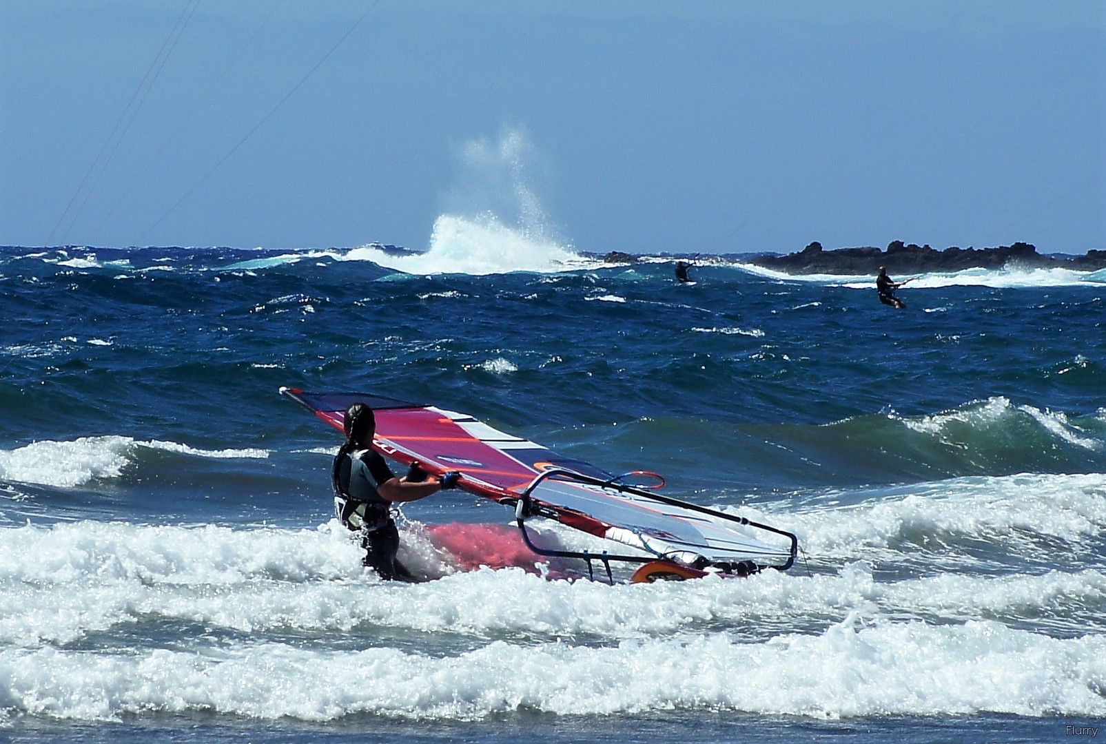 Алексей изучал фордак в волнах… он тоже на волны океанские попал впервые, Фуертевентура все-таки не в счет, через несколько дней и его слило, причем гораздо дальше, чем Сашу. Практически на конец лагуны. Чуть чуть не ушел за гору. Вечером повел нас показывать, откуда тащил парус с доской по очереди. В том месте даже в кроссовках и в отлив тяжело идти, а в прилив , босиком и с барахлом….но, ему повезло, чуть дальше уже были только отвесные стенки. Побил доску на 50 евро, и немного ободрал ноги, так что без жертв…