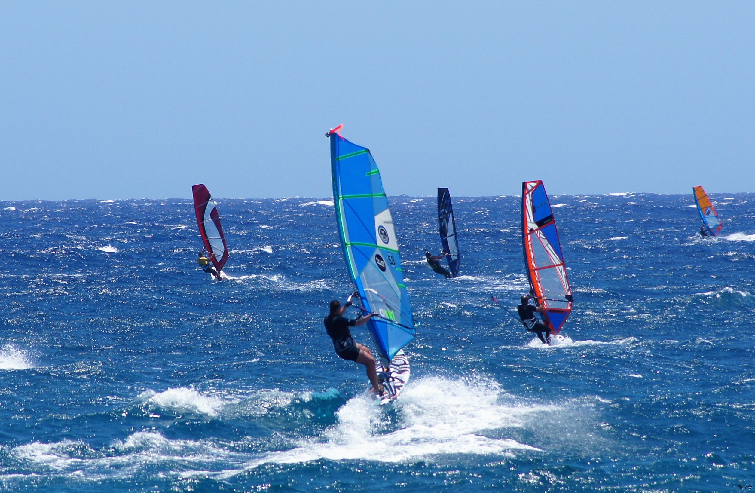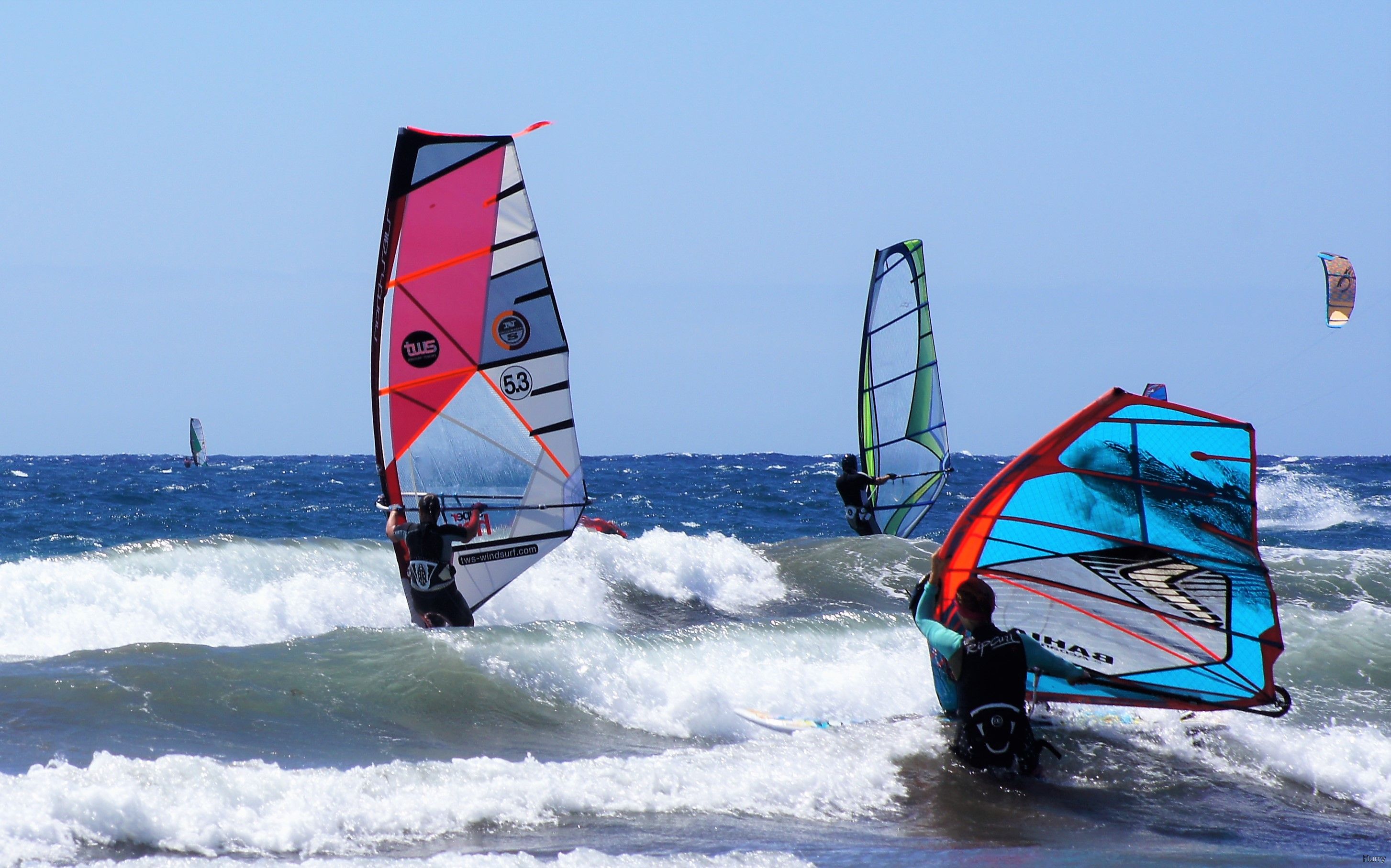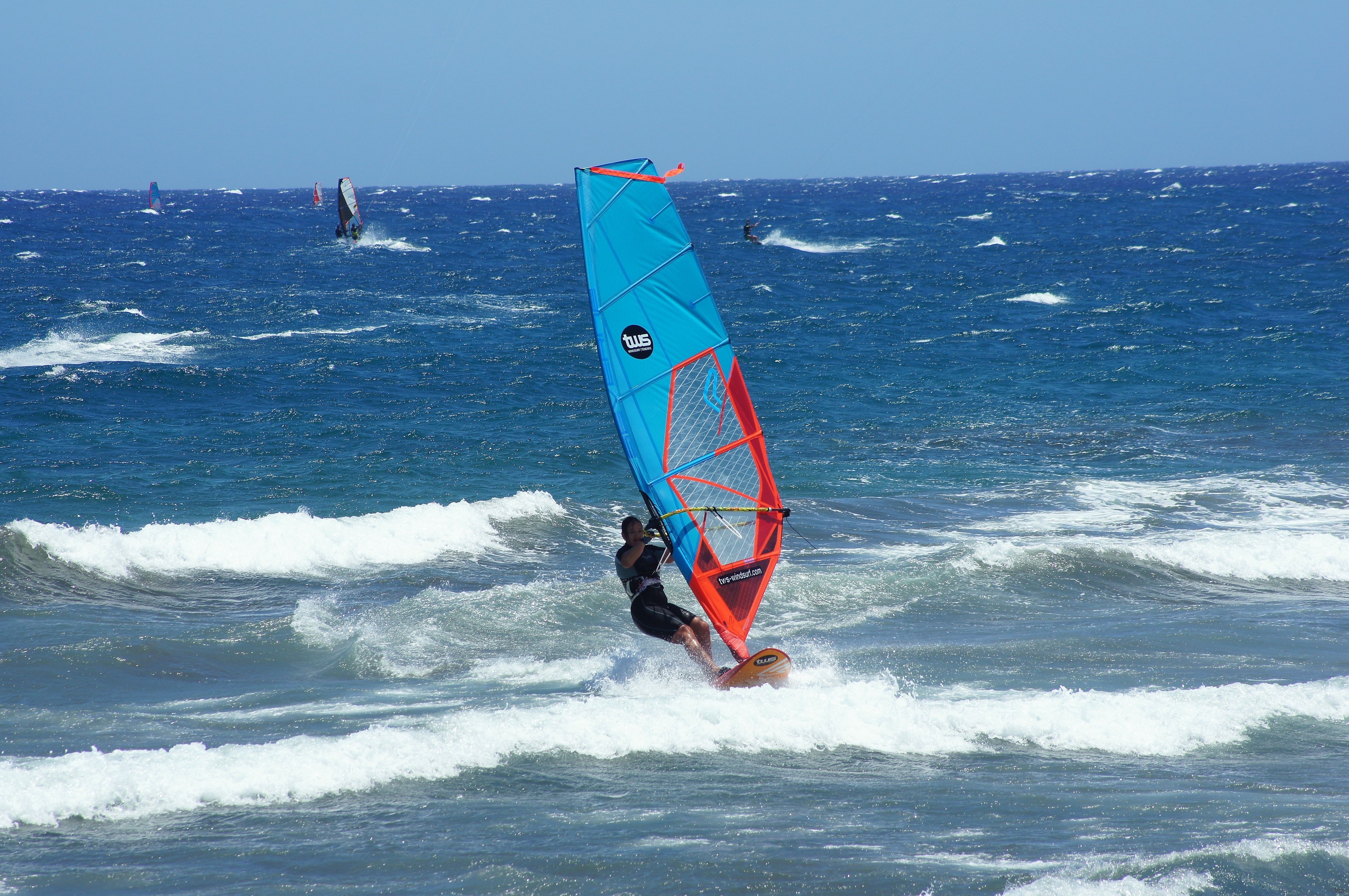 Но отключили не катастрофически. В воскресение еще катнули на 5,0, и доски взяли поменьше, Аня даже взяла 4,5 в середине дня, когда усилилось, но не надолго. Пошел, наконец, оторвавшись от работы с нами и Саша, причем ухитрился взять 5,2 (хотя ему советовали 6,2) , доску Табу взял у испанцев в Bahia, а Алексей на 106 РРд и 6,8 (он тяжелый, да и любитель больших парусов). Олег же решил попробовать свою спину и на «разочек» взял комплект у Саши.
