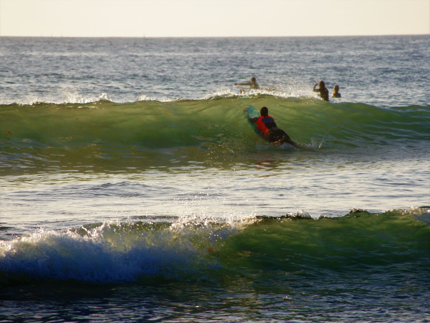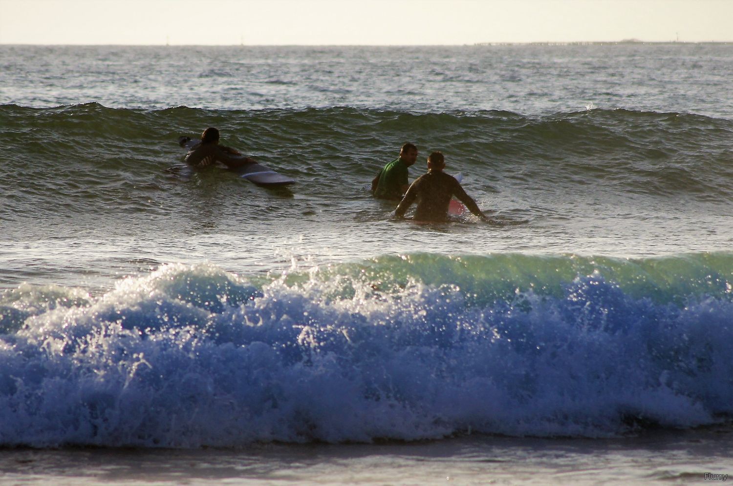 Благодаря Валере начали осваивать серф. Я, правда, к тому времени уже сильно потянула плечо, поэтому выгребаться на больших волнах Лас-америкас не могла бы, да и доски мне хватало только очень маленькой (по моему-то минимальному опыту), в общем, работала фотографом на закате... Берег там, конечно специфический... а когда уже темнеть начинает, то проходить камни в волнах, не просто. Аня помучалась вечерок,